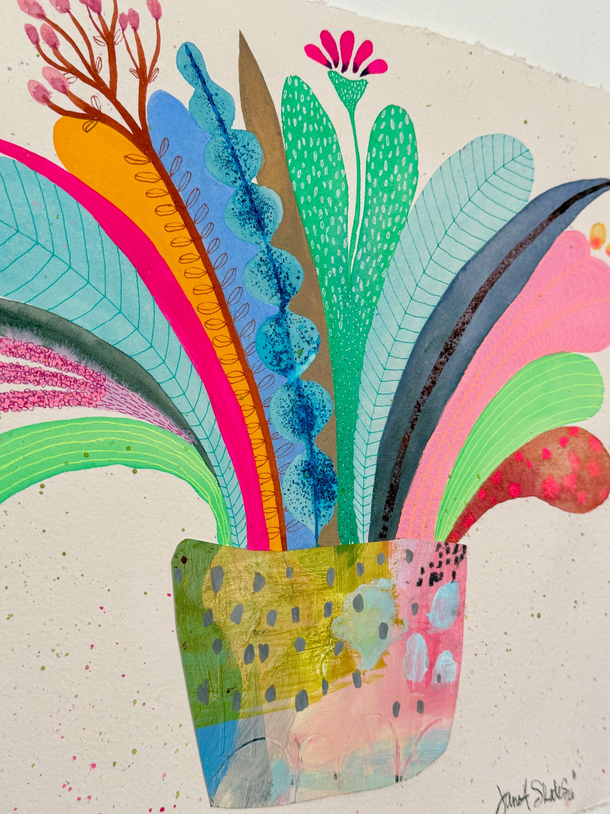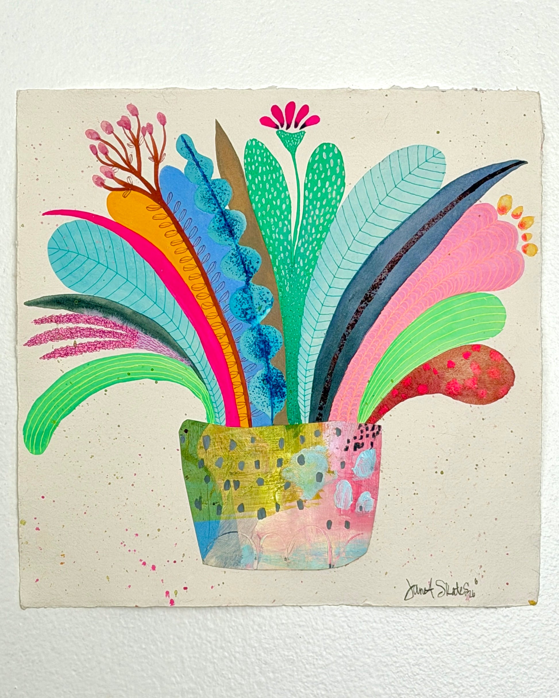 An original painting collage vase holds a brilliant collection of flora and fauna. Bright, bold and beautiful this piece is sure to be a focal point in your space. This piece is 10” x 10” on handmade paper worked in gouache, watercolor, pen and ink and gelli roll pens, signed on front and reverse, it ships flat and is ready to frame as desired. For your convenience domestic shipping is included. International customers drop us an email for purchase and shipping info. We are happy to assist!