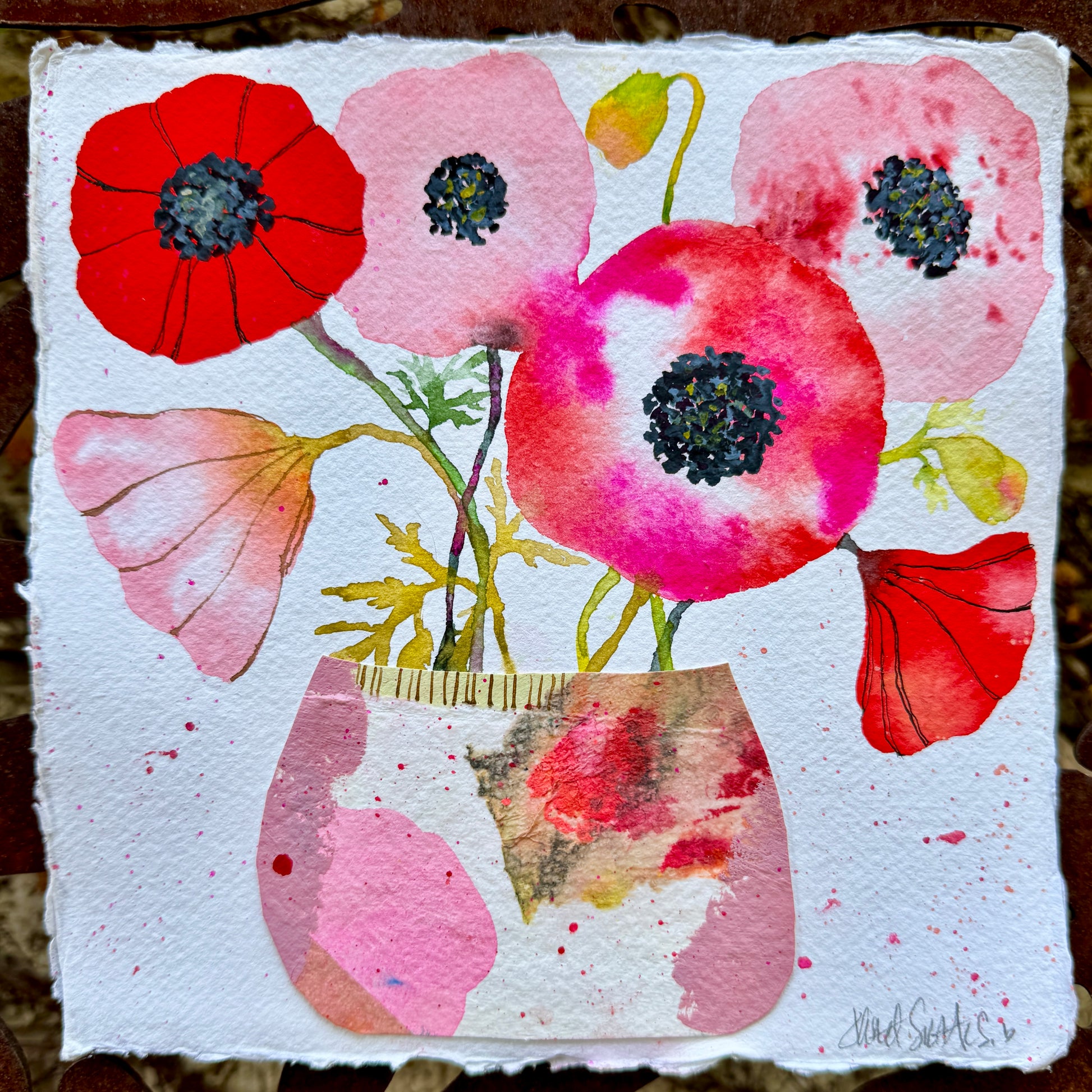 Introducing “Along Croft Road” an original work in watercolor and gouache featuring a vibrant blends of pinks, reds and subtle greens all nestled in an original painting collage vase. Created on handmade recycled paper by its a delicate rough edge. For your convenience domestic shipping is included. For international clients please drop me and email for purchase and shipping details. I’m happy to assist!