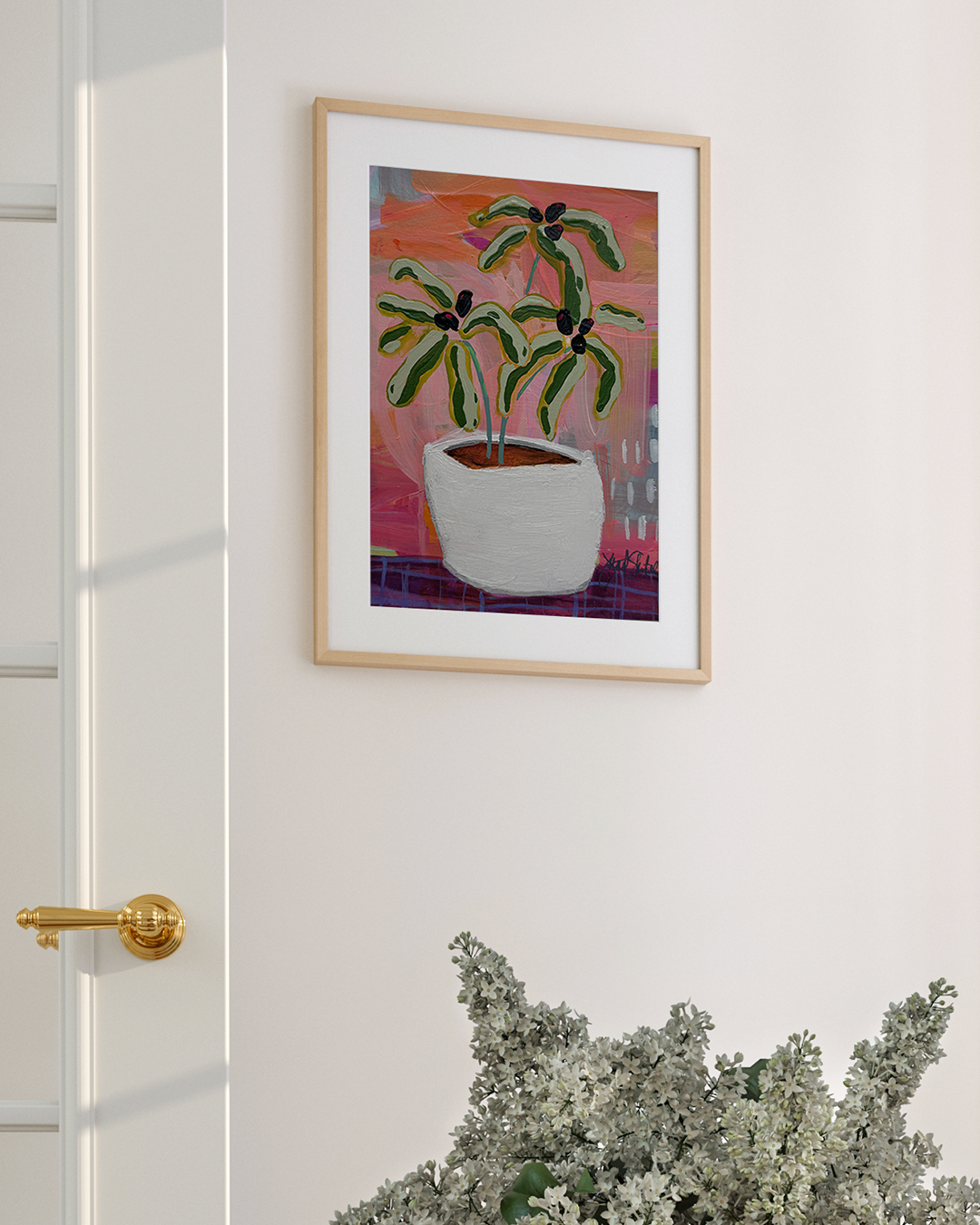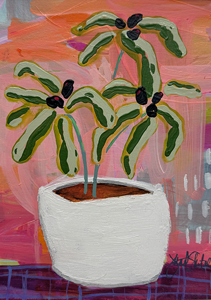 "At My Table" captures a peaceful moment where nature and home life converge. The plant, with its bold and vibrant leaves, sits in a simple yet elegant pot, creating a feeling of warmth and welcoming. The dynamic use of color, from the earthy tones of the pot to the playful pops of green and purple, adds life to any space. This original piece on mixed media paper celebrates the beauty of simplicity and the comfort of having nature by your side, making it a perfect addition to your home or office.