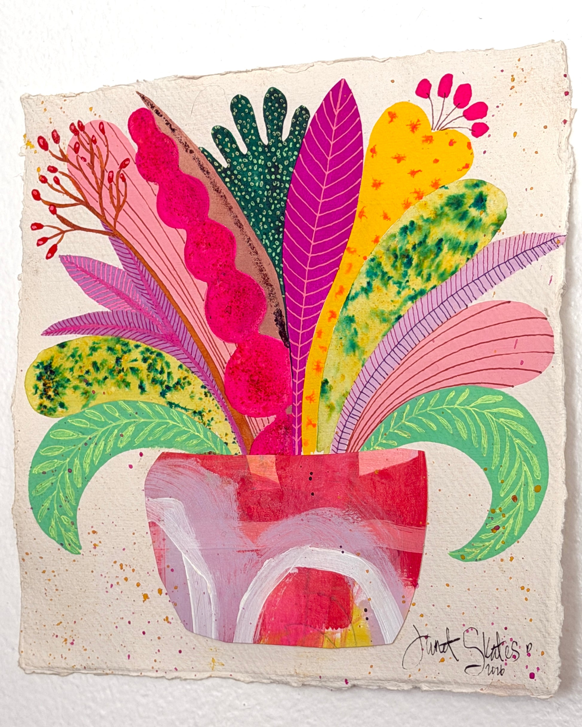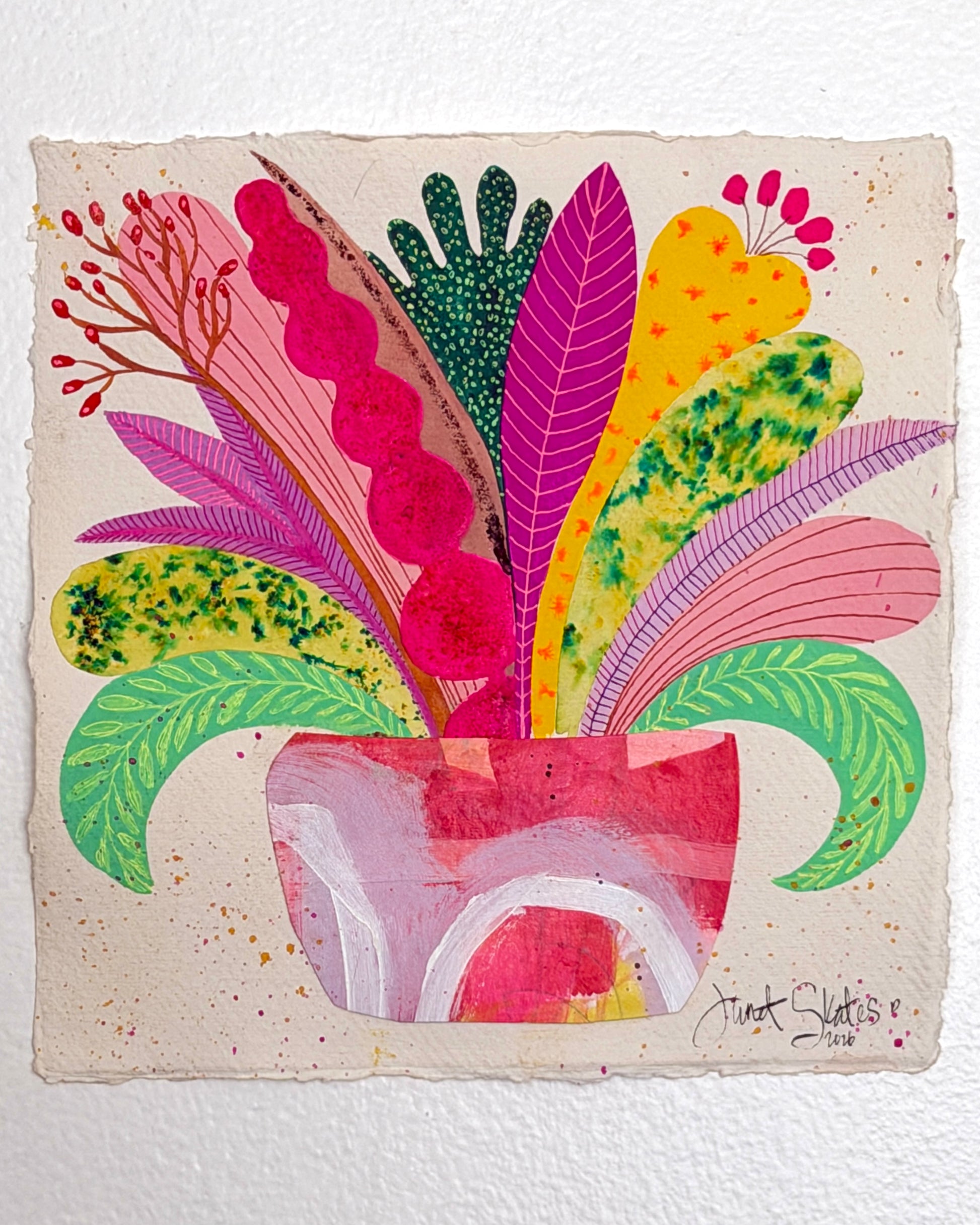 An original painting collage vase holds a brilliant collection of flora and fauna. Bright, bold and beautiful this piece is sure to be a focal point in your space. This piece is 6” x 6” on handmade paper, signed on front and reverse, it ships flat and is ready to frame as desired. For your convenience domestic shipping is included. International customers drop us an email for purchase and shipping info. We are happy to assist!