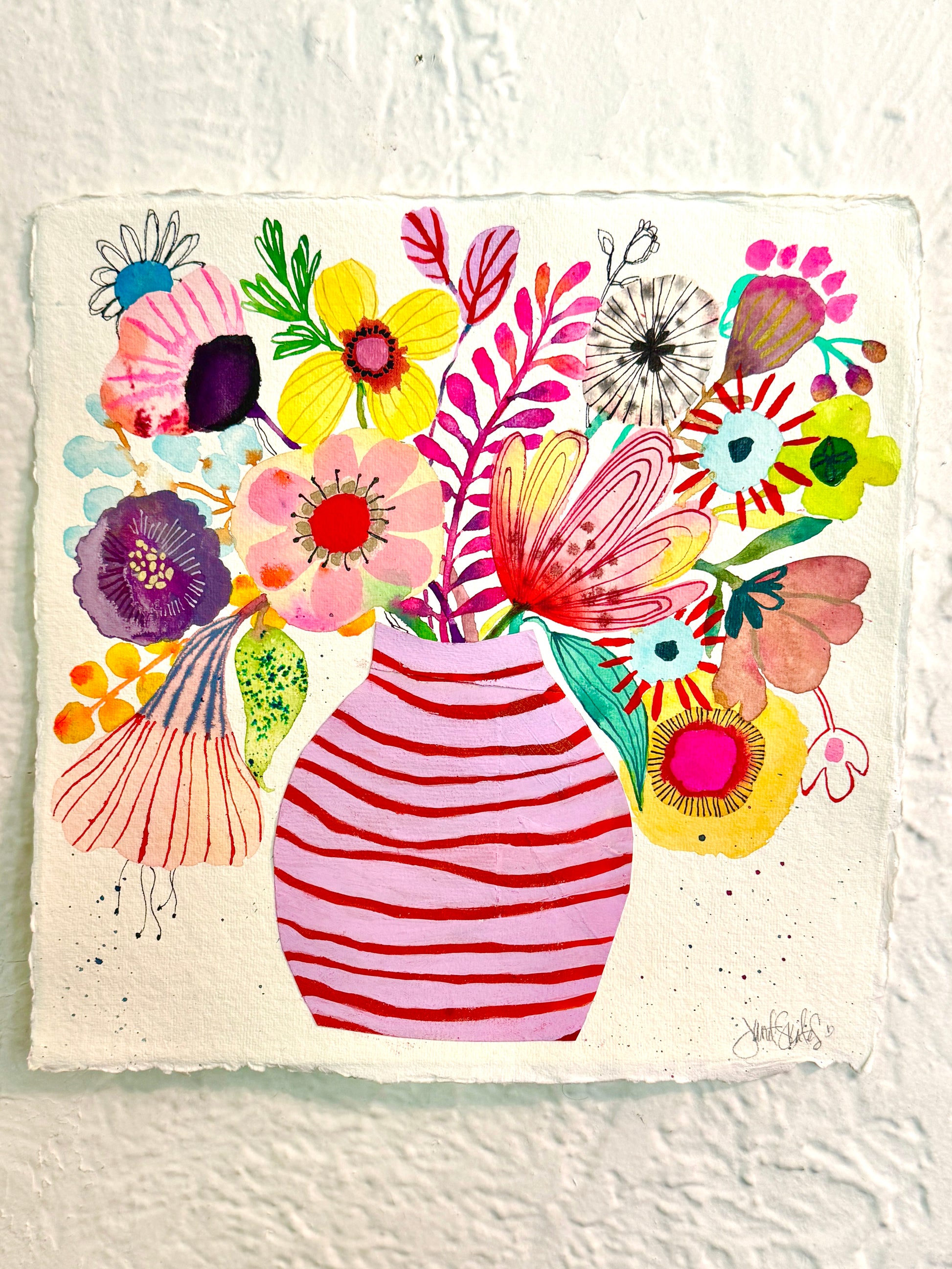 Introducing Bindon Bend Road and a bouquet you might pick up while walking along the way. A vibrant mix of blooms all gathered in an original painting collage vase. This piece is worked in gouache and watercolor, pen and ink, on handmade paper sized 12” x 12” with a gorgeous ragged edge. It is signed both front and back, ships flat and is ready to frame. For your convenience domestic shipping is included. For international clients drop me and email for purchase and shipping details. Always happy to assist!