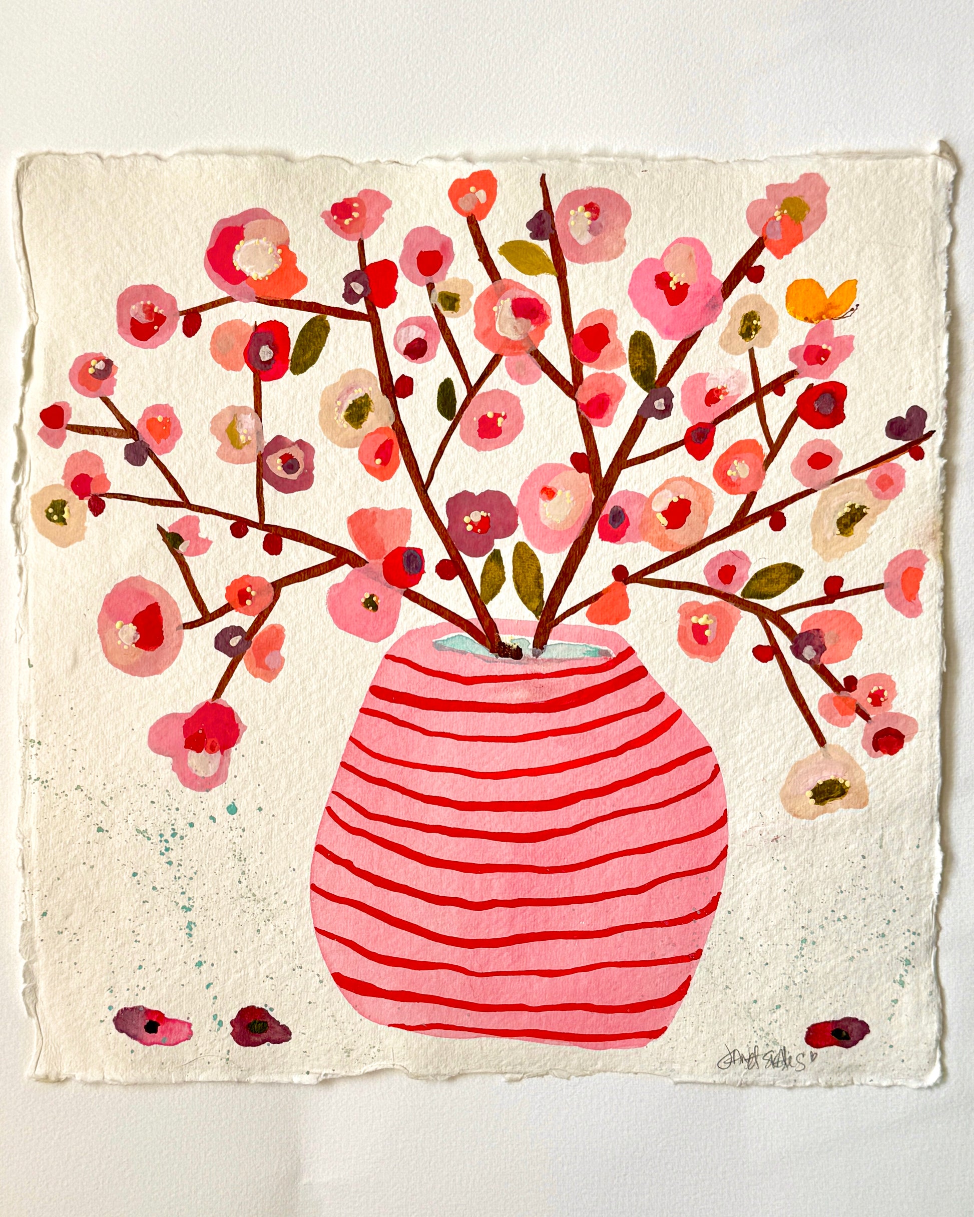 Bracket’s Bridge Road is created on 12” square handmade paper using gouache and watercolor. This beautiful assortment of Quince cuttings sits in a fantastical red and pink vase. I have a beautiful Quince in my back garden that delights me with blooms every year. So happy to put them on paper and share! Domestic shipping is included. For international clients drop us an email for purchase and shipping details.