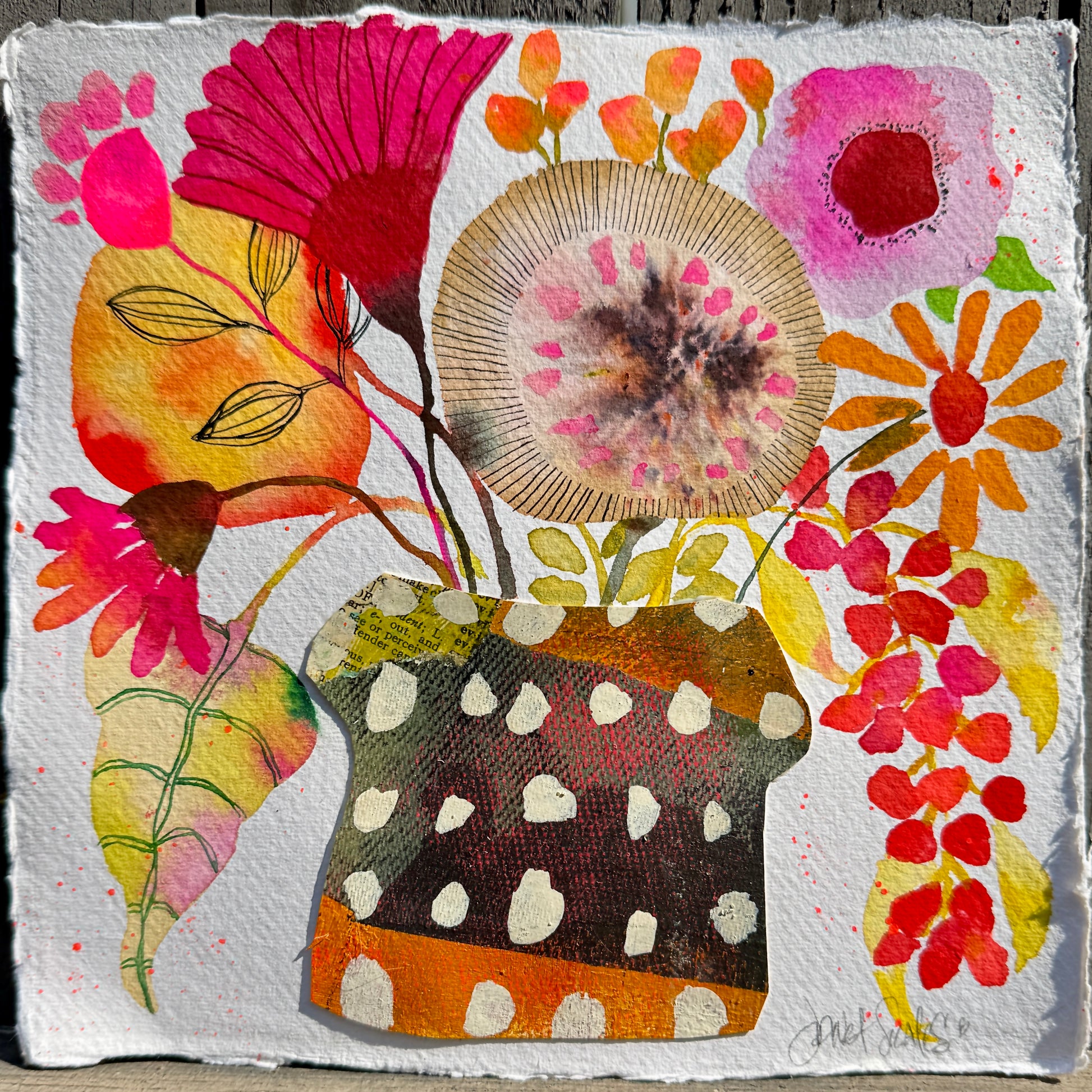 Helston Crossing captures the essence of autumn with its rich palette of oranges, reds, pinks, and greens. Created with gouache and watercolor on handmade recycled watercolor paper, this piece features a unique collage vase that adds depth and originality. Signed and shipped flat, it offers a refined touch to any collection or space. Domestic shipping is included, while international buyers are welcome to contact us for details.