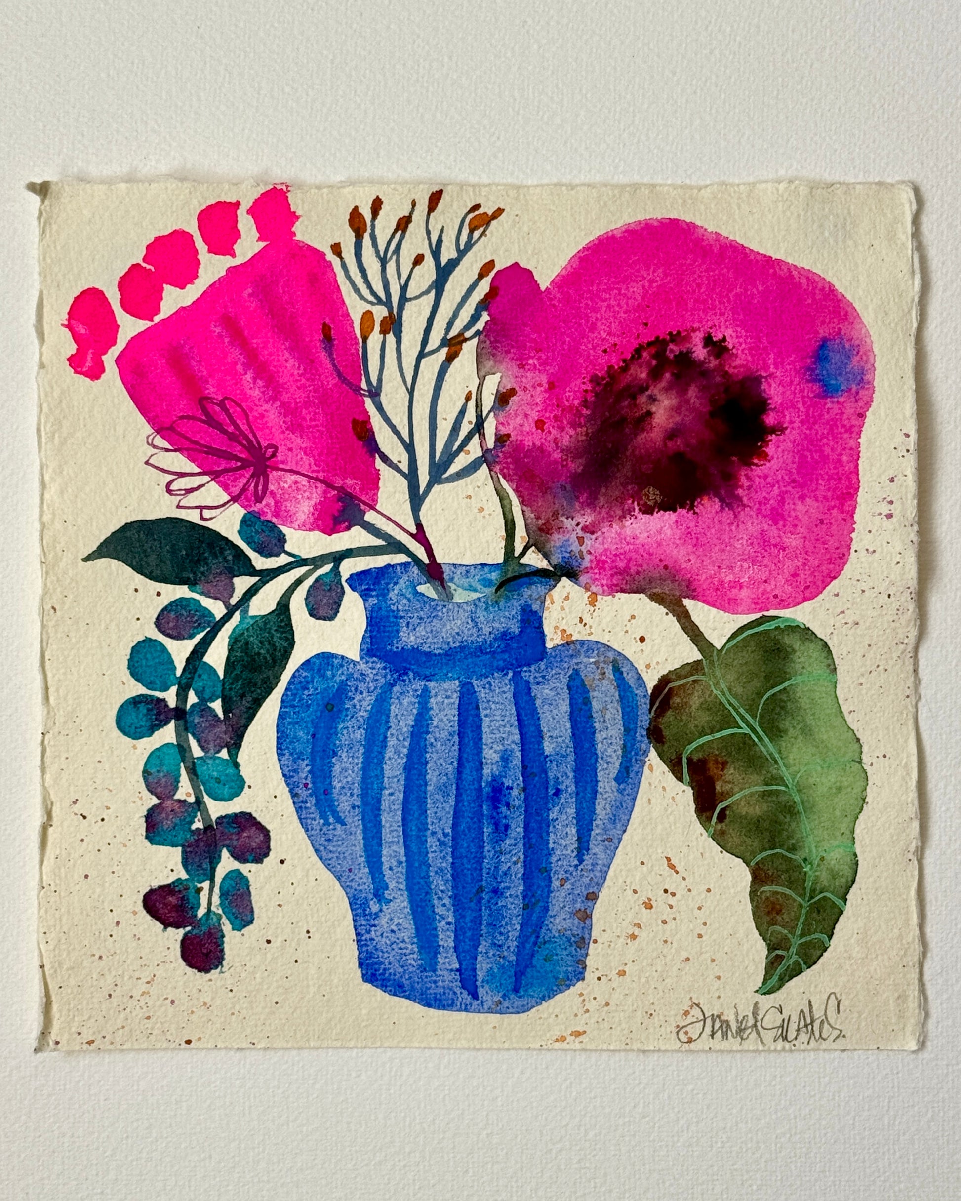 Maiden Lane is a clutch of exotic pinks in a lovely cobolt vase. Gouache and watercolor are used on 6” x 6” handmade paper. For your convenience domestic shipping is included. International clients please drop us an email for purchase and shipping details.