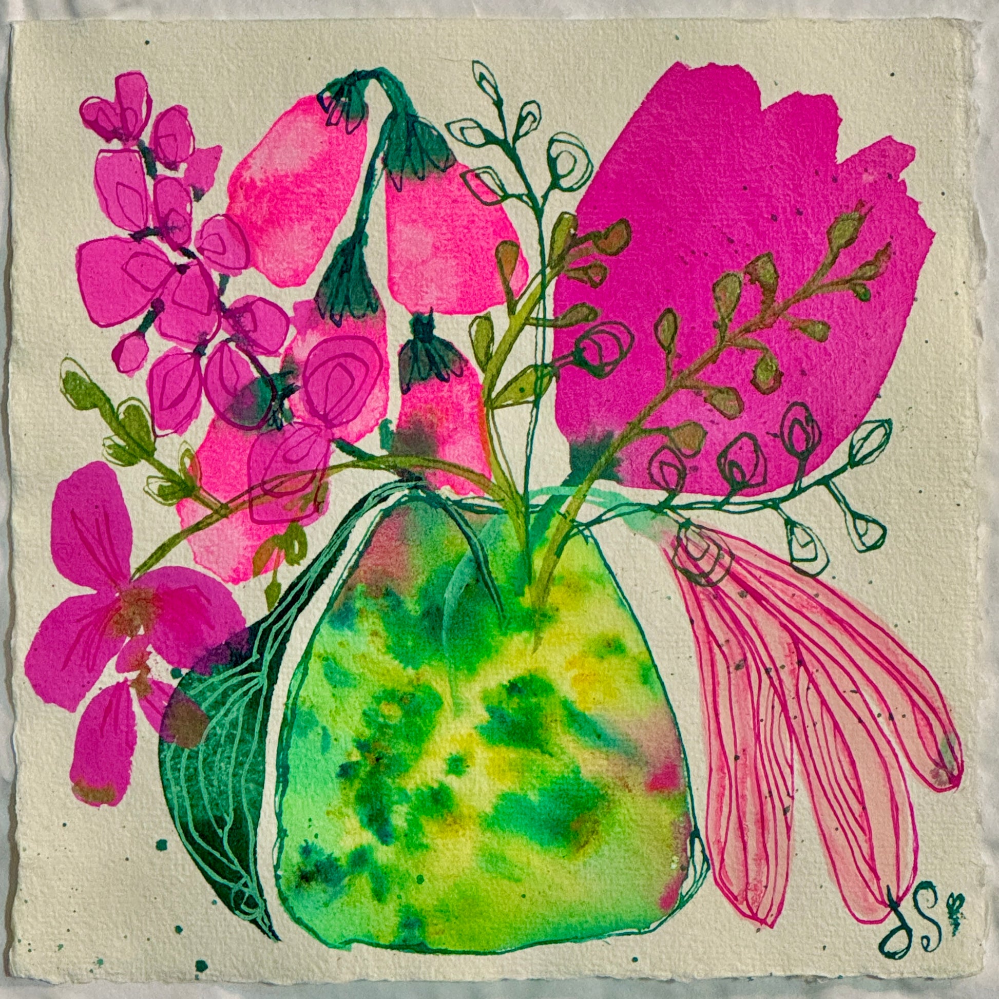Introducing Pretty As a Pea, an original piece created with watercolor in vibrant greens and pinks. This mesmerizing focal point captures the eye and imagination. Add a touch of luxury to any space with this one-of-a-kind creation. 6” x 6” on handmade recycled paper with a gorgeous ragged edge. As always, we’re happy to ship internationally. Please drop us an email and we’ll get it sorted for you.