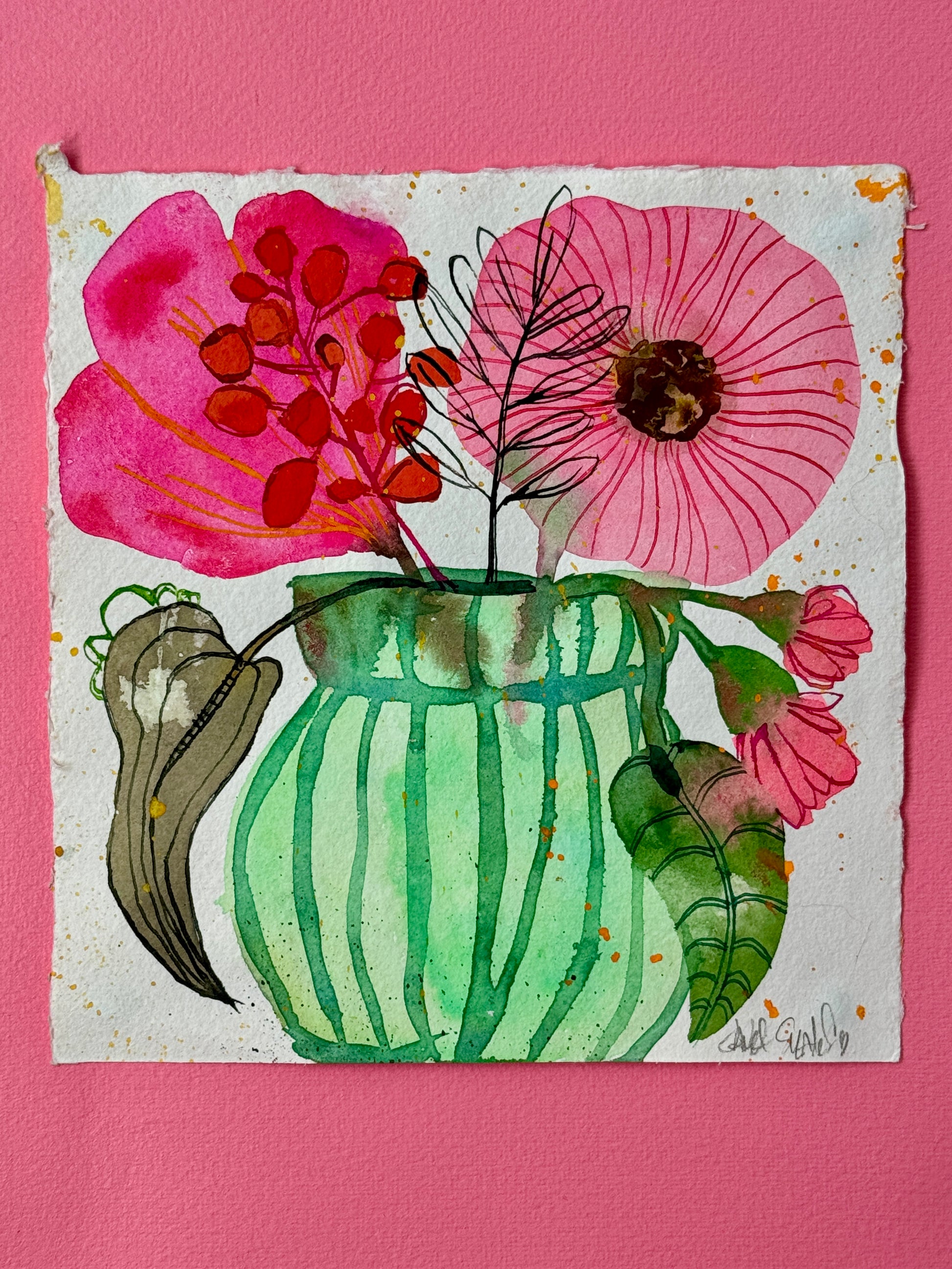 Green and pink make a perfect pair in this piece known as Trelissick Lane. This piece is worked in watercolor, with pen and ink details, on 6” x 6” handmade paper. The work is signed front and back and ships flat. For your convenience domestic shipping is included. For international clients please drop us an email for purchase and shipping details. We’re happy to assist!